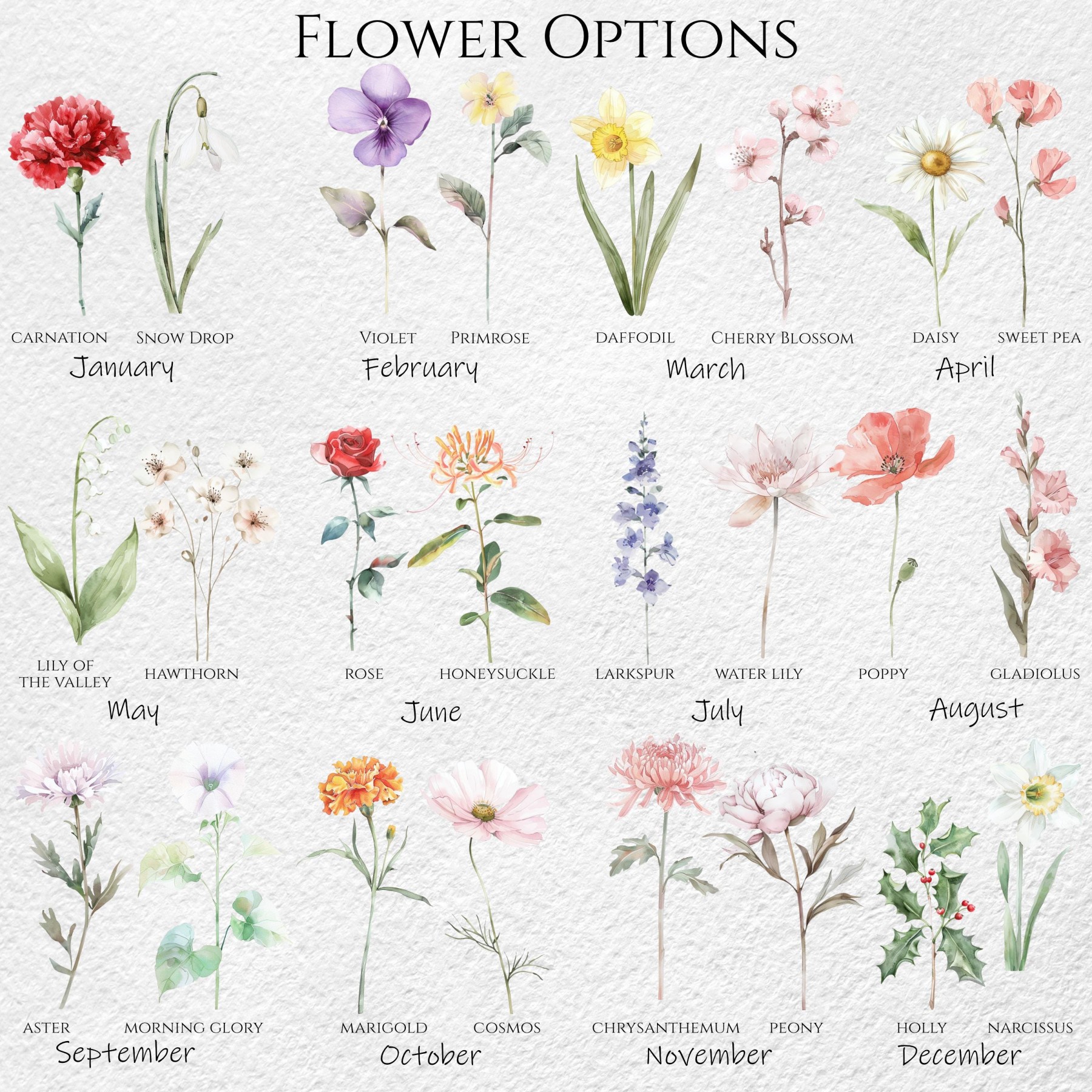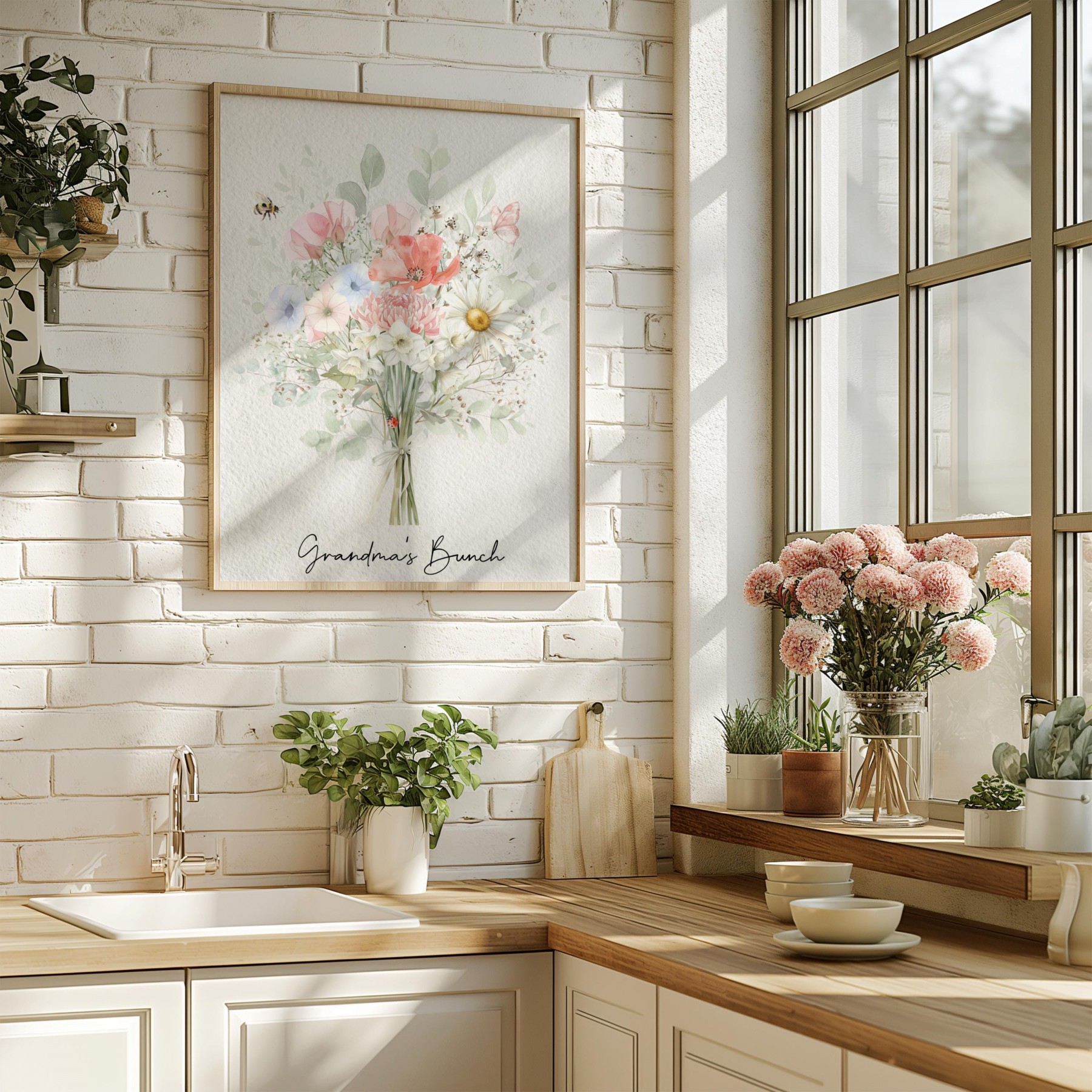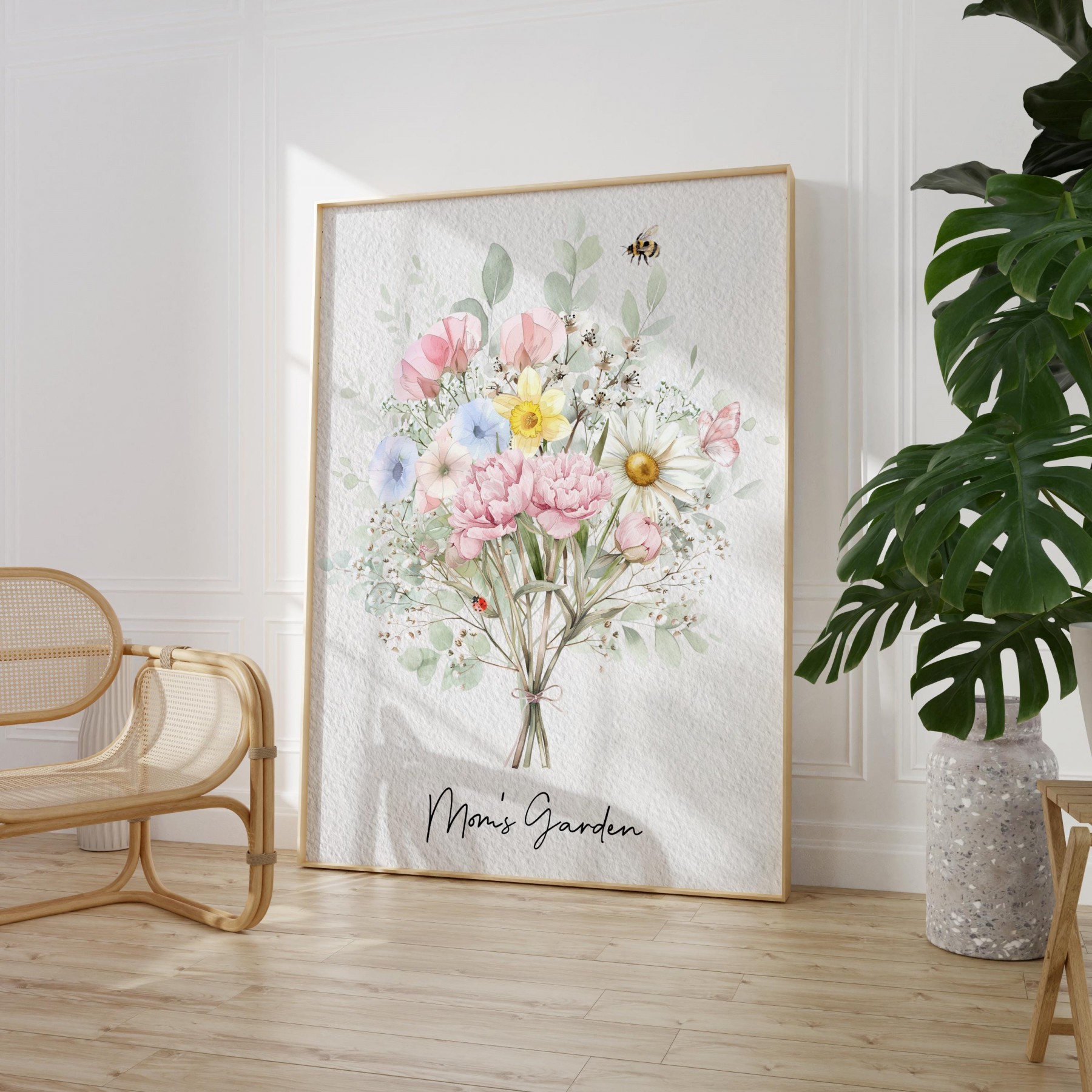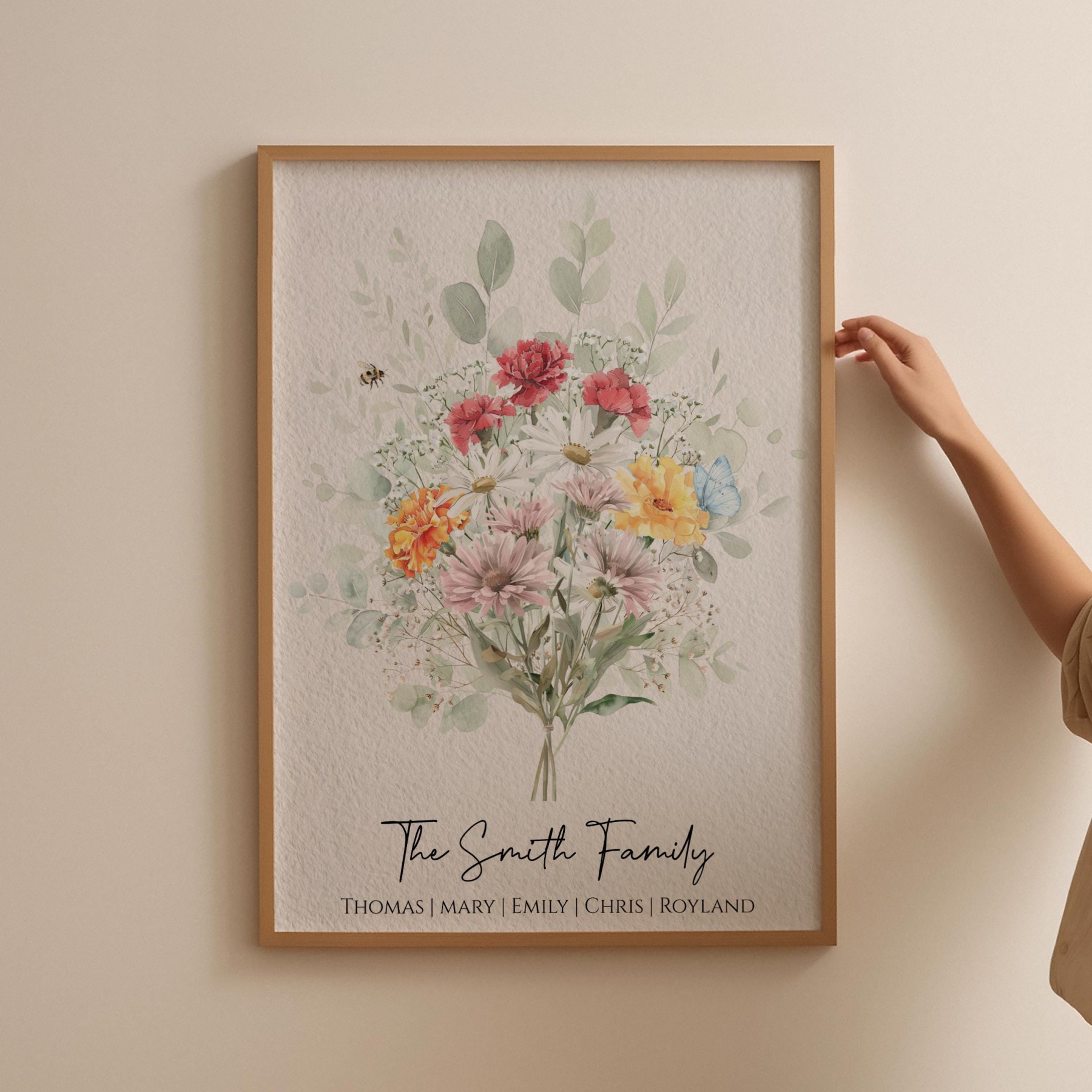 Family Birth Flower Bouquet | Gift for Mom Personalized Watercolor Birth Month Flower Print Custom Framed Physical Print