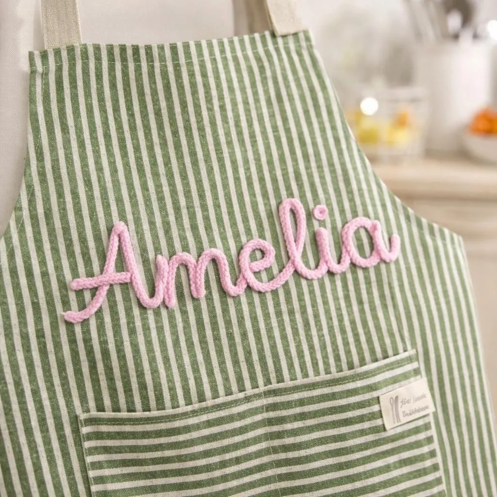 What truly makes this apron special is the custom hand-crocheted name on the chest.