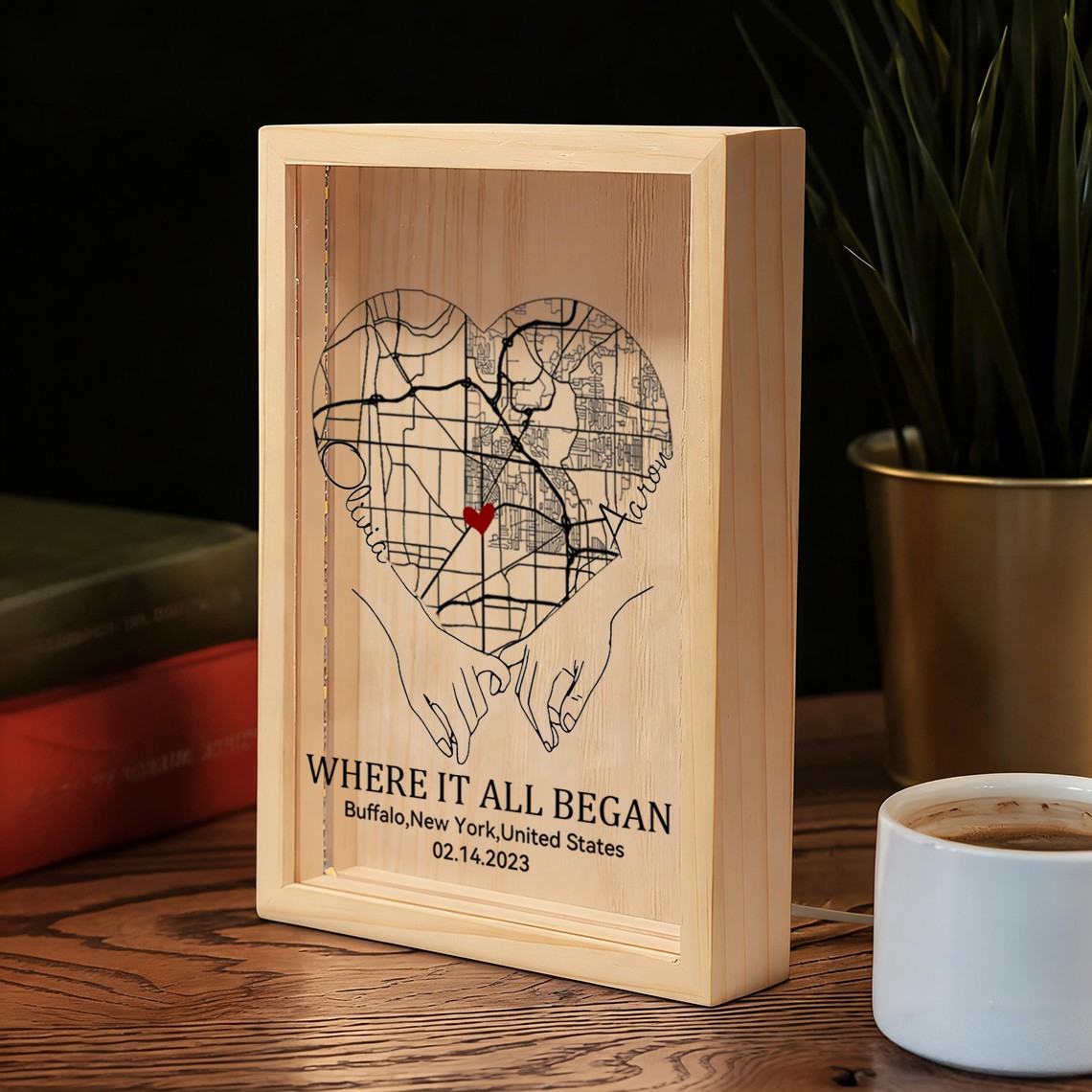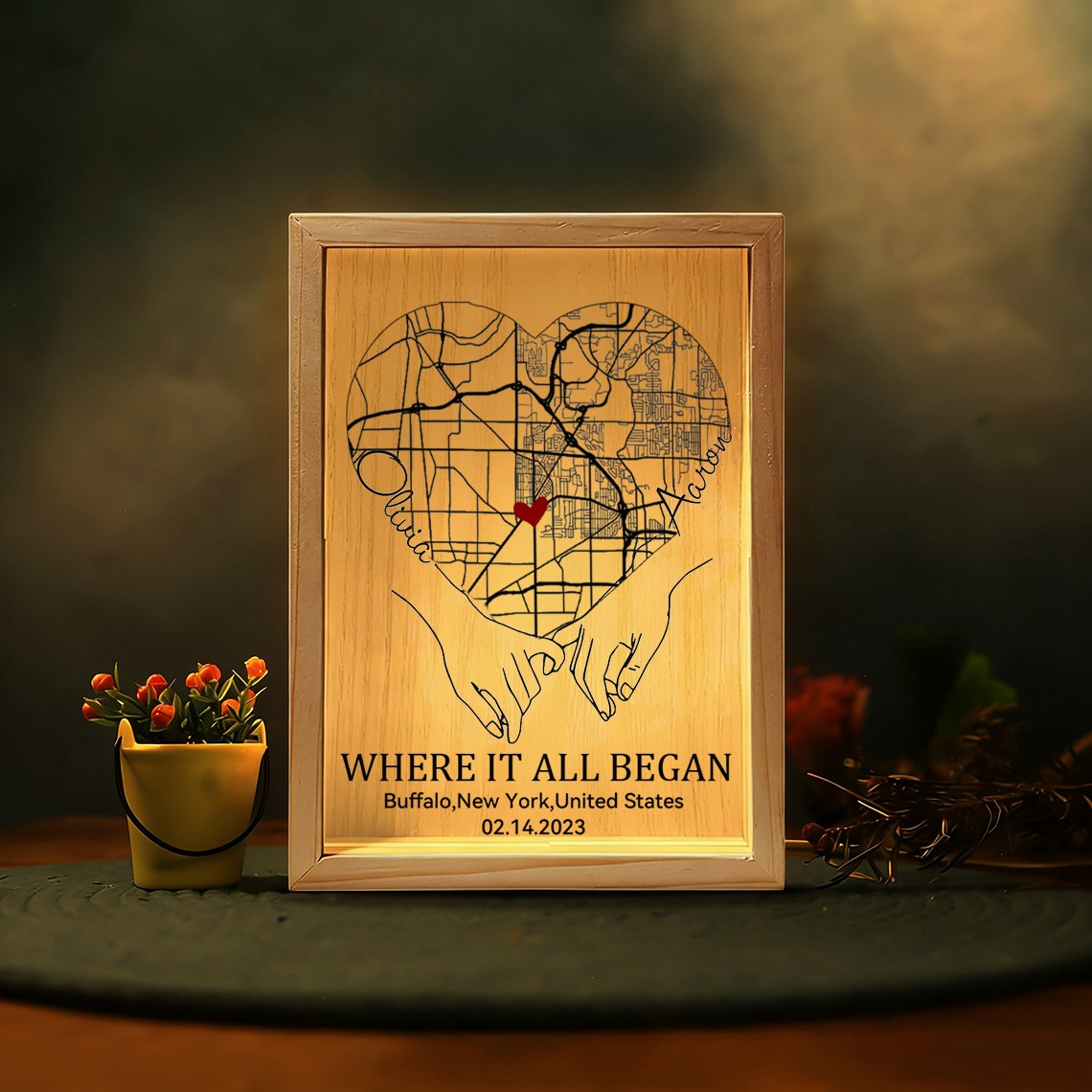 The Personalized Where It All Began Map Light Box for Couple turns a meaningful location into a warm and eye catching display. Featuring a custom map design that highlights the place your story began, this light box transforms a special memory into a timeless piece of home décor. Made with a clear acrylic panel and a natural wood base, it adds a modern and elegant touch to bedrooms, desks, and living spaces. The print appears on one side with a soft mirrored reflection on the back, creating a clean and layered visual effect.