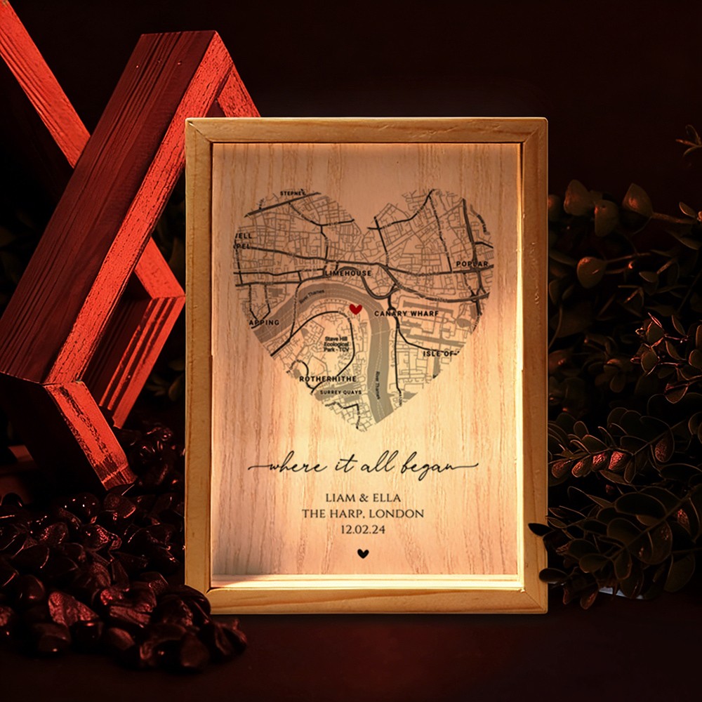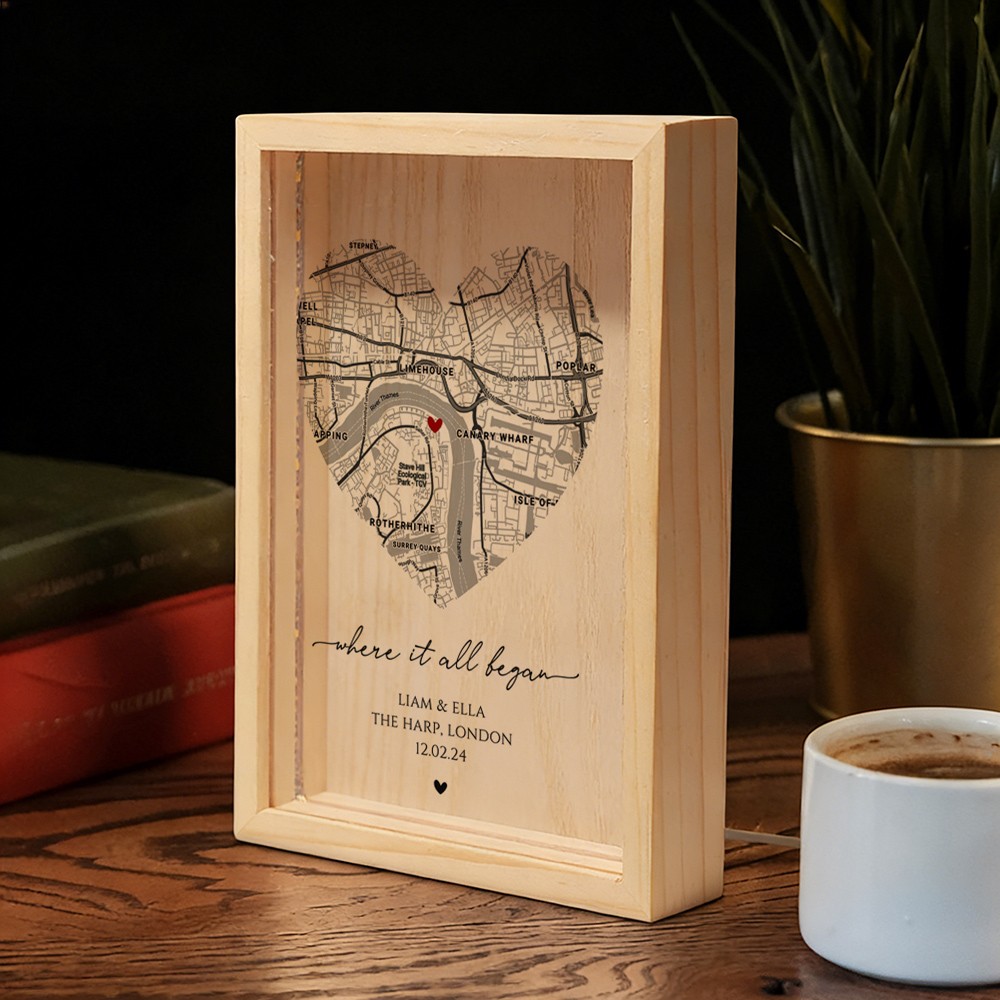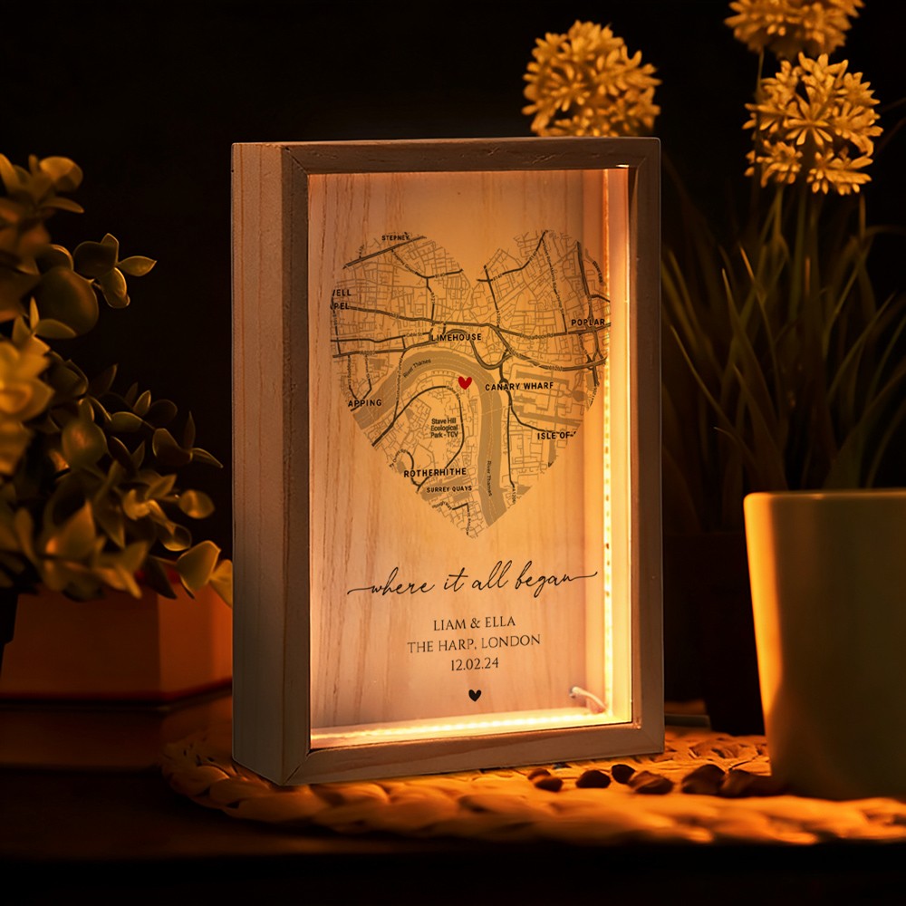 The Personalized Where It All Began Map Light Box for Couple turns a meaningful location into a warm and eye catching display. Featuring a custom map design that highlights the place your story began, this light box transforms a special memory into a timeless piece of home décor. Made with a clear acrylic panel and a natural wood base, it adds a modern and elegant touch to bedrooms, desks, and living spaces. The print appears on one side with a soft mirrored reflection on the back, creating a clean and layered visual effect.