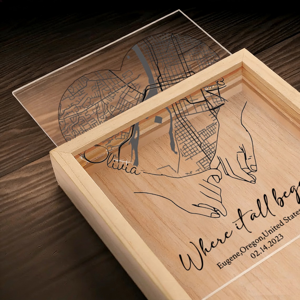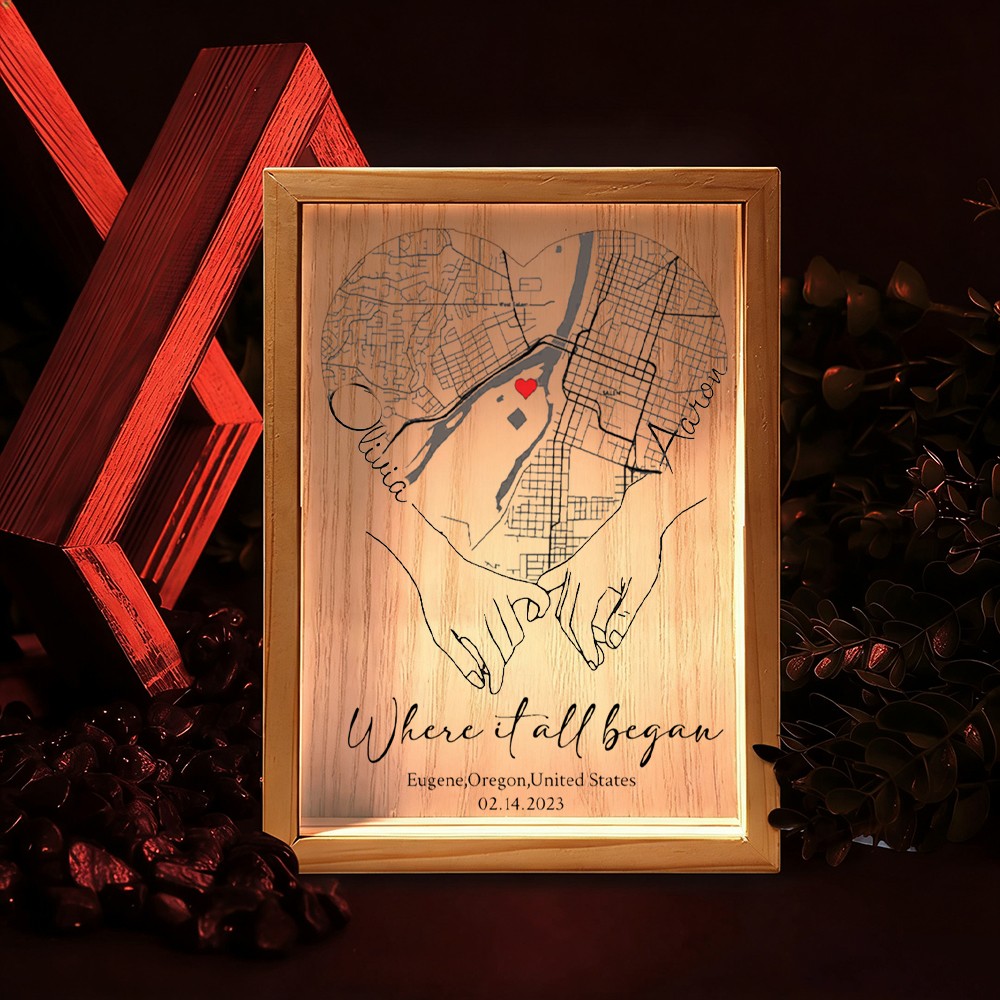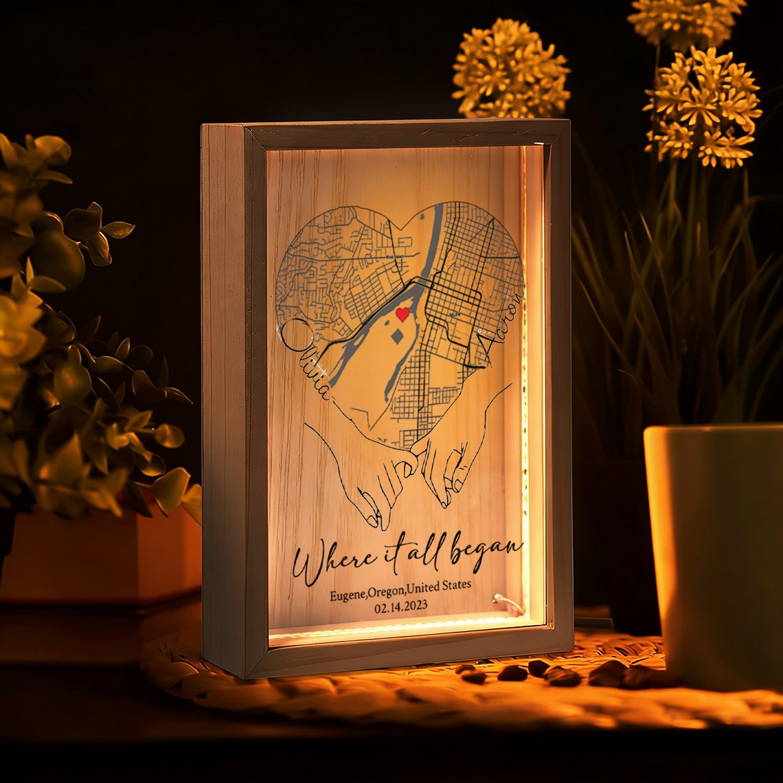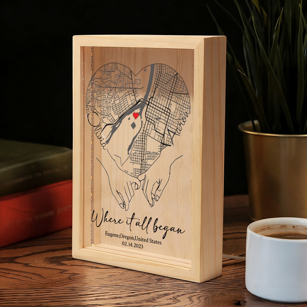 The Personalized Where It All Began Map Light Box for Couple turns a meaningful location into a warm and eye catching display. Featuring a custom map design that highlights the place your story began, this light box transforms a special memory into a timeless piece of home décor. Made with a clear acrylic panel and a natural wood base, it adds a modern and elegant touch to bedrooms, desks, and living spaces. The print appears on one side with a soft mirrored reflection on the back, creating a clean and layered visual effect.