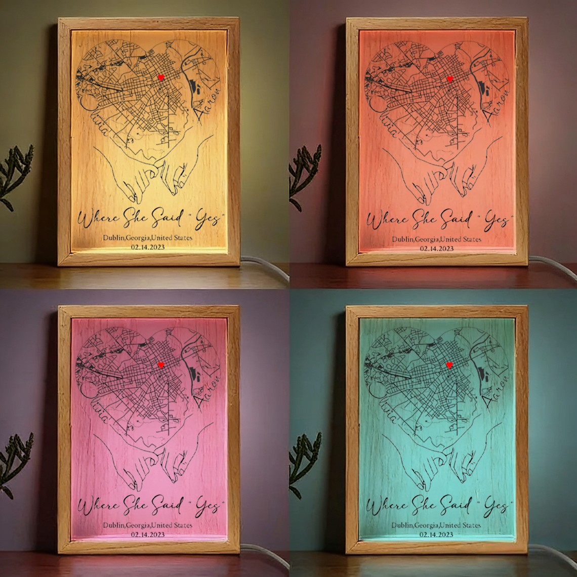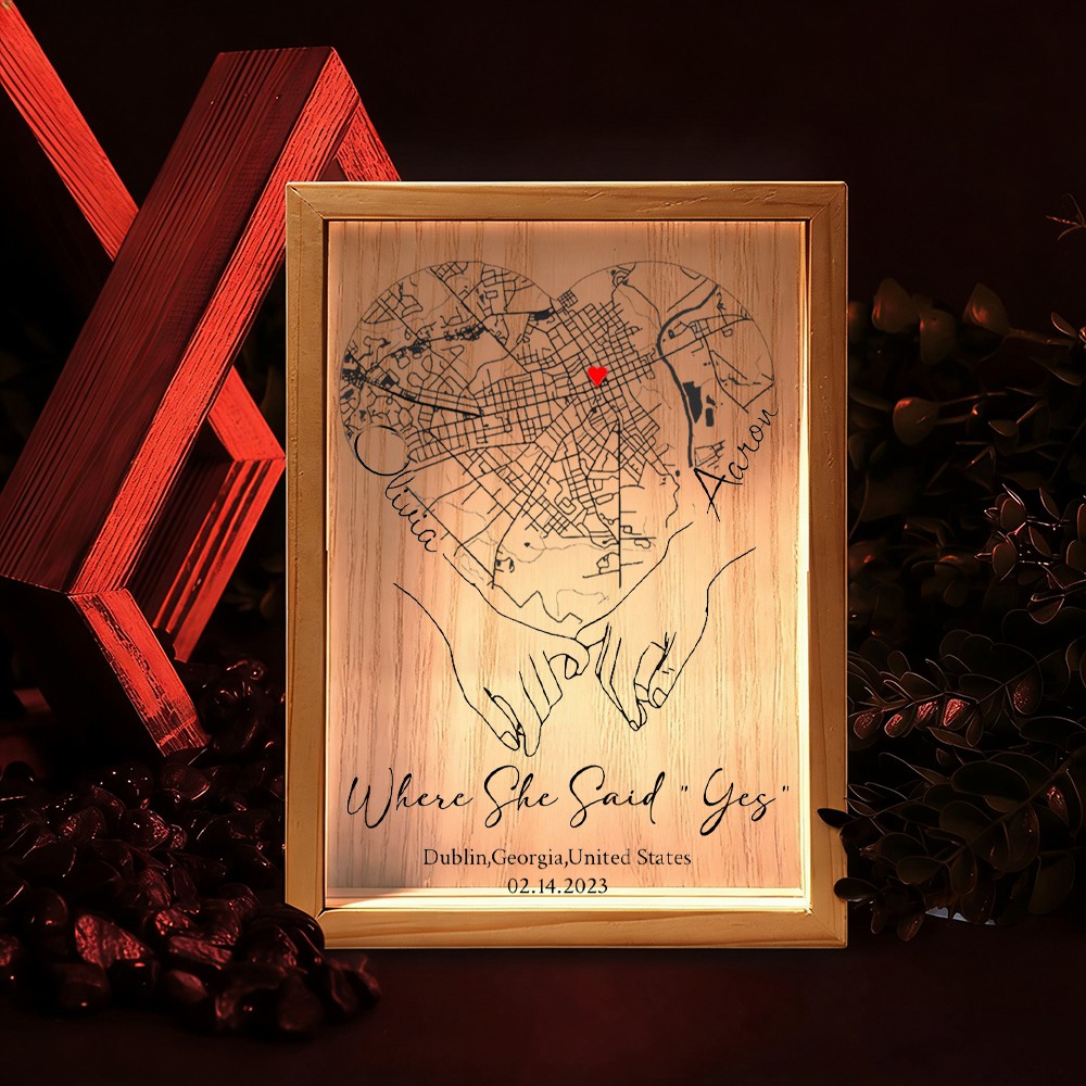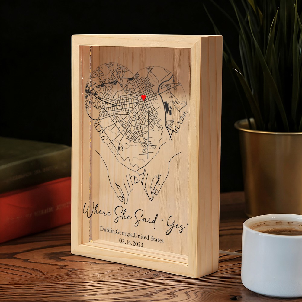 Personalized Where She Said Yes Map Light Box for Couple turns a meaningful location into a warm and eye catching display. Featuring a custom map design that highlights the place your story began, this light box transforms a special memory into a timeless piece of home décor. Made with a clear acrylic panel and a natural wood base, it adds a modern and elegant touch to bedrooms, desks, and living spaces. The print appears on one side with a soft mirrored reflection on the back, creating a clean and layered visual effect.