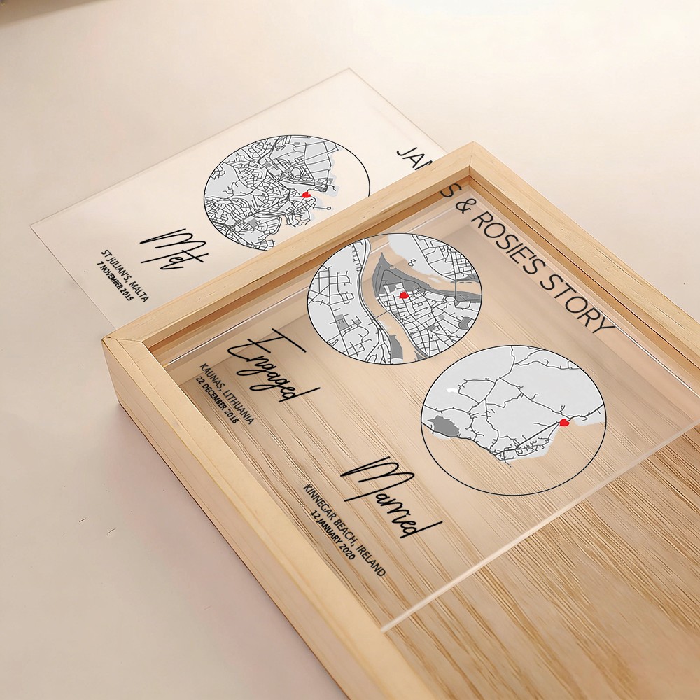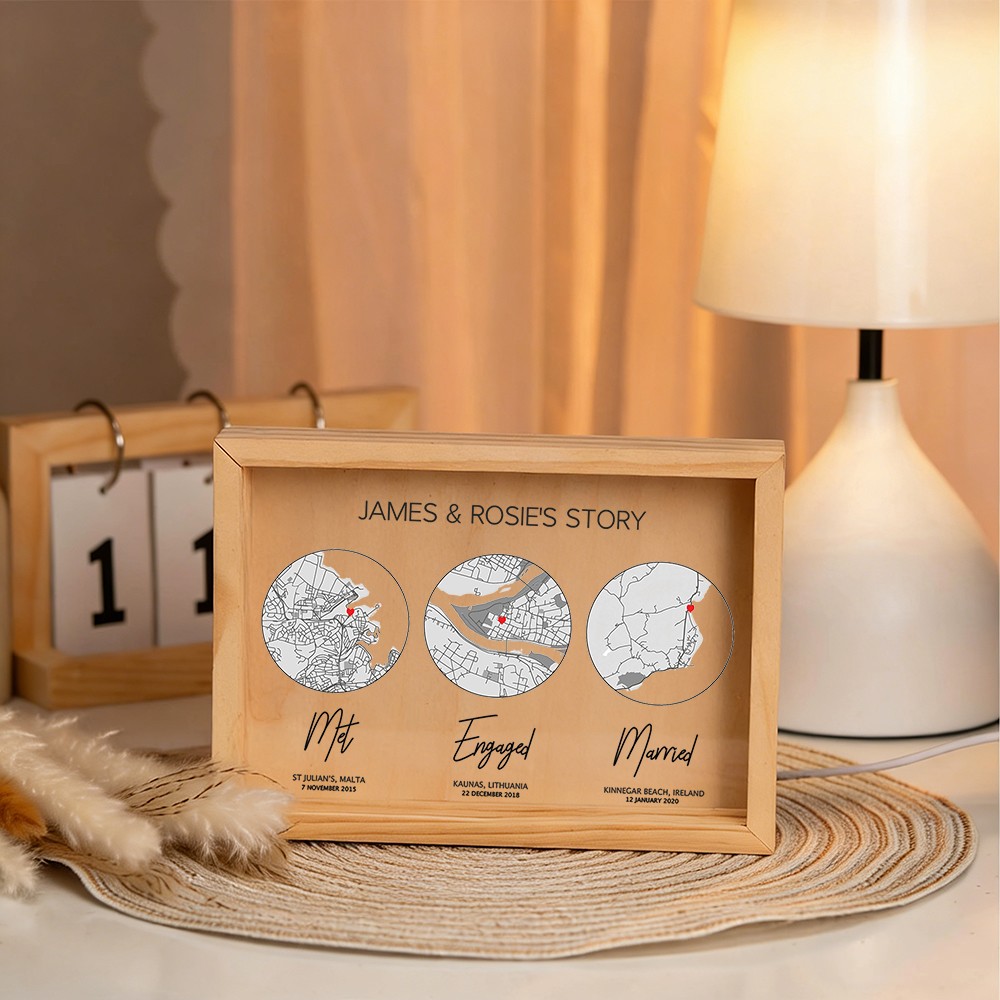 The Personalized Love Story Map Wooden Light Box for Couple transforms your most important moments into a warm and meaningful display. Designed to showcase one to three custom map locations, it visually tells the story of your journey together — from where you first met to the milestones that followed.